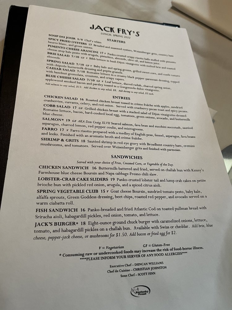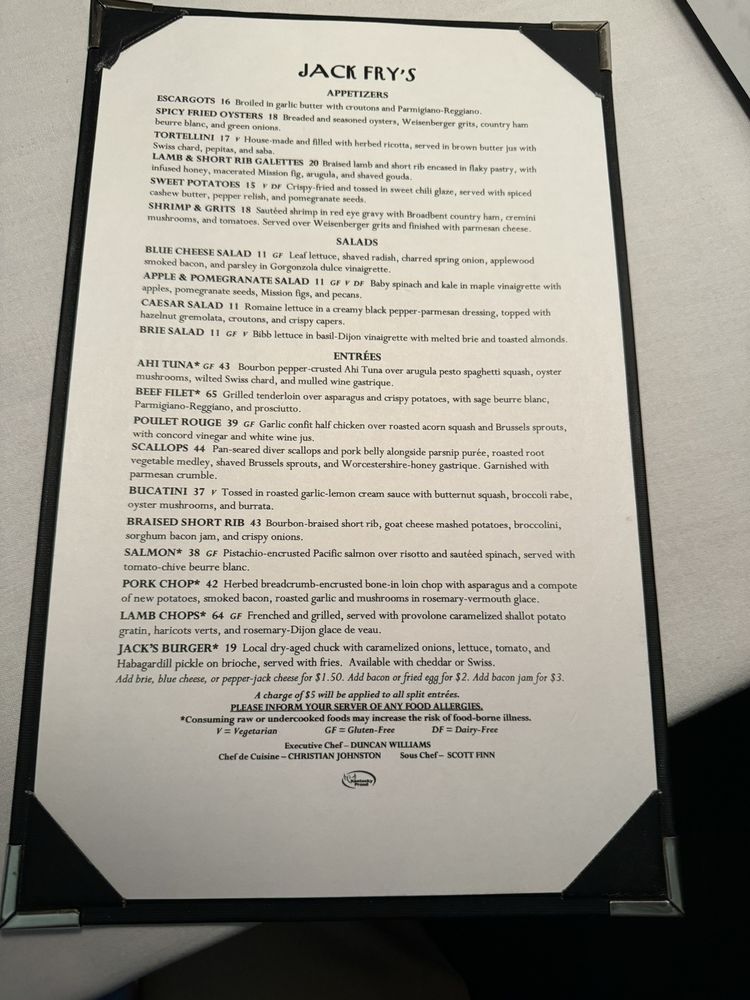 `Jack Fry's` is a New American restaurant located in Louisville, KY. This classy establishment offers a wide range of amenities, including reservation options, takeout, and delivery services. With limited vegetarian options and accessible parking, Jack Fry's caters to various dietary needs and preferences. Customers rave about the exceptional service, delectable food, and romantic ambiance. Highlights include the garlicky escargot, creamy brie salad, and fall-spiced butternut squash agnolotti. The menu also features favorites like shrimp and grits, short rib, and filet. The cozy atmosphere, complete with vintage photos, adds to the overall dining experience. Whether for a special occasion or a casual night out, Jack Fry's promises a memorable and delicious meal.